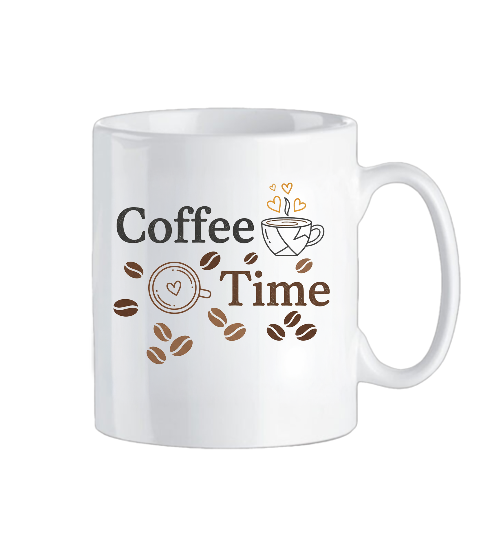 Coffee Time mug με κλασικό και cozy σχέδιο, ιδανικό για καφέ ή τσάι, εκφραστικό και πρακτικό για καθημερινή χρήση. Πρόκειται για λευκή κεραμική κούπα 11oz τύπου mug με ειδική χημική επίστρωση για εκτύπωση sublimation, ανθεκτική και εύκολη στη χρήση.