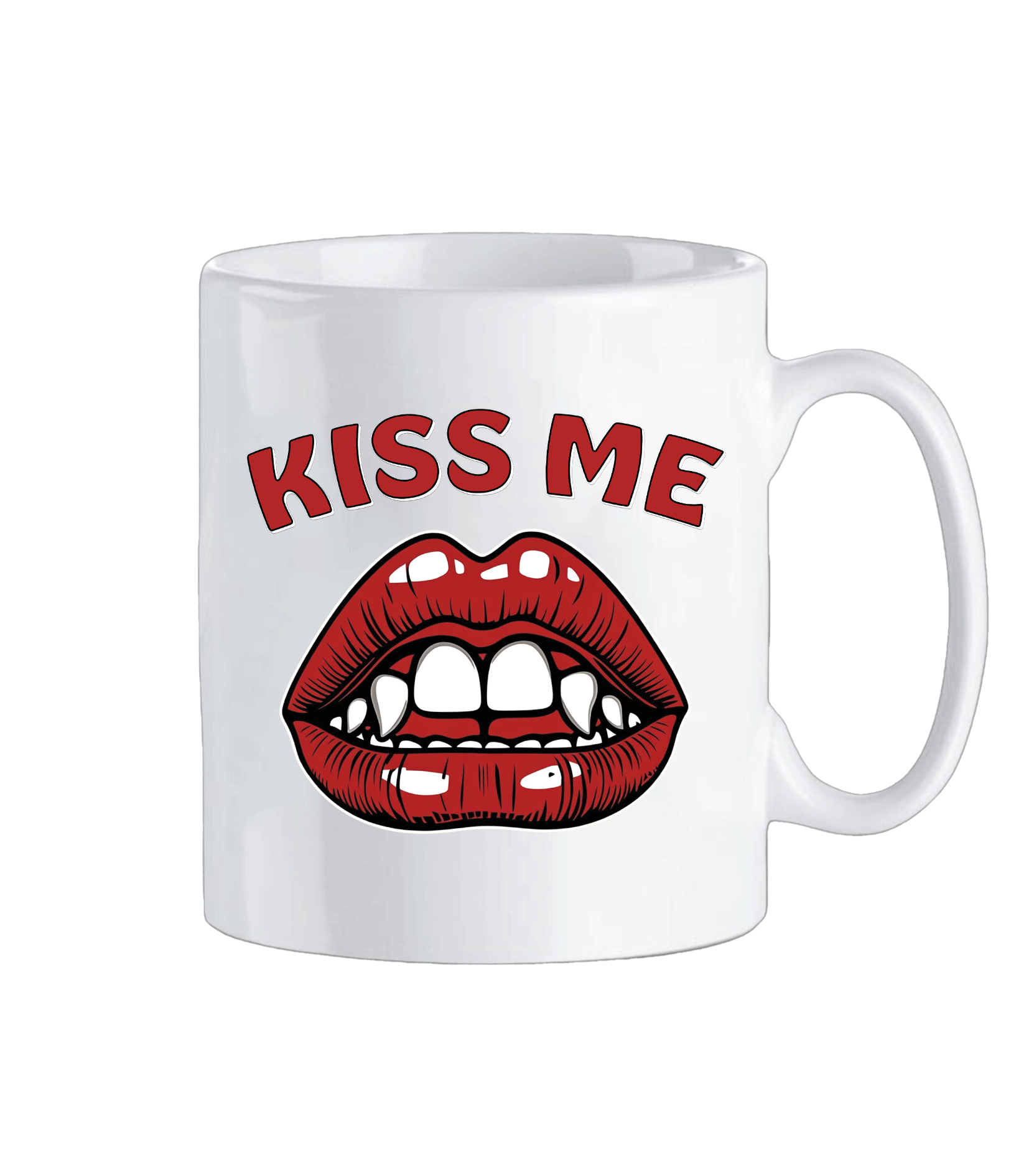 Kiss My mug με τολμηρό και φανταστικό σχέδιο, που απεικονίζει κόκκινα χείλη και δόντια εμπνευσμένα από Δράκουλα. Ιδανικό για καφέ ή τσάι, εκφραστικό και ιδιαίτερο για καθημερινή χρήση ή ως ξεχωριστό δώρο. Πρόκειται για λευκή κεραμική κούπα 330ml mug με ειδική χημική επίστρωση για εκτύπωση sublimation, ανθεκτική και εύκολη στη χρήση.