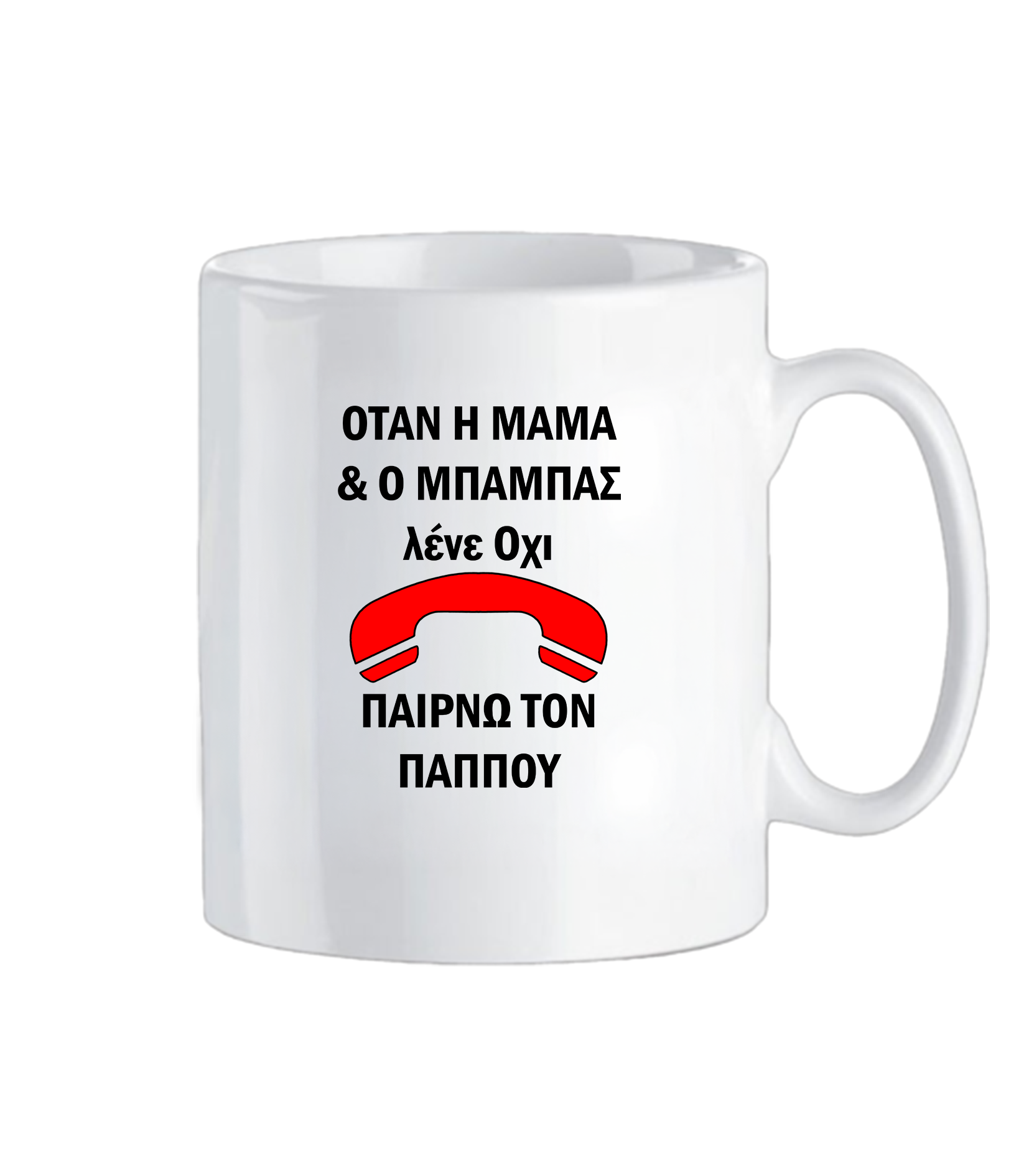 Όταν ο μπαμπάς και η μαμά λένε Όχι… παίρνω τηλέφωνο τον παππού! mug με αστείο και παιχνιδιάρικο σχέδιο, ιδανικό για καφέ ή τσάι, διασκεδαστικό και ξεχωριστό για καθημερινή χρήση ή ως δώρο σε οικογένεια και φίλους. Πρόκειται για λευκή κεραμική κούπα τύπου mug με ειδική χημική επίστρωση για εκτύπωση sublimation, ανθεκτική και εύκολη στη χρήση.