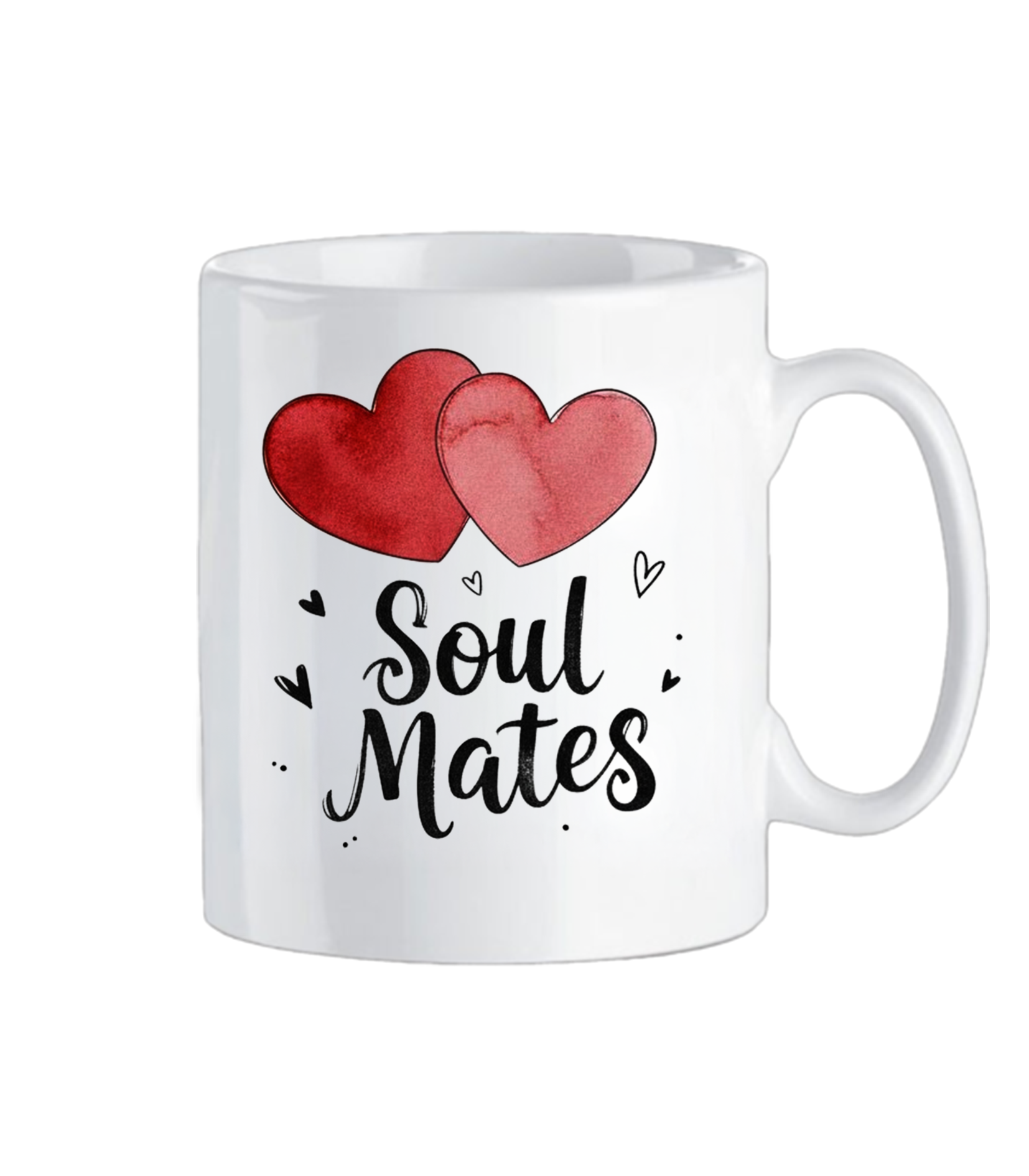 Soul Mates mug με ρομαντικό σχέδιο που απεικονίζει το κείμενο “Soul Mates” και δύο ενωμένες κόκκινες καρδιές, ιδανικό για καφέ ή τσάι, τρυφερό και κομψό για καθημερινή χρήση ή ως ξεχωριστό δώρο αγάπης. Πρόκειται για λευκή κεραμική κούπα τύπου mug με ειδική χημική επίστρωση για εκτύπωση sublimation, ανθεκτική και εύκολη στη χρήση.