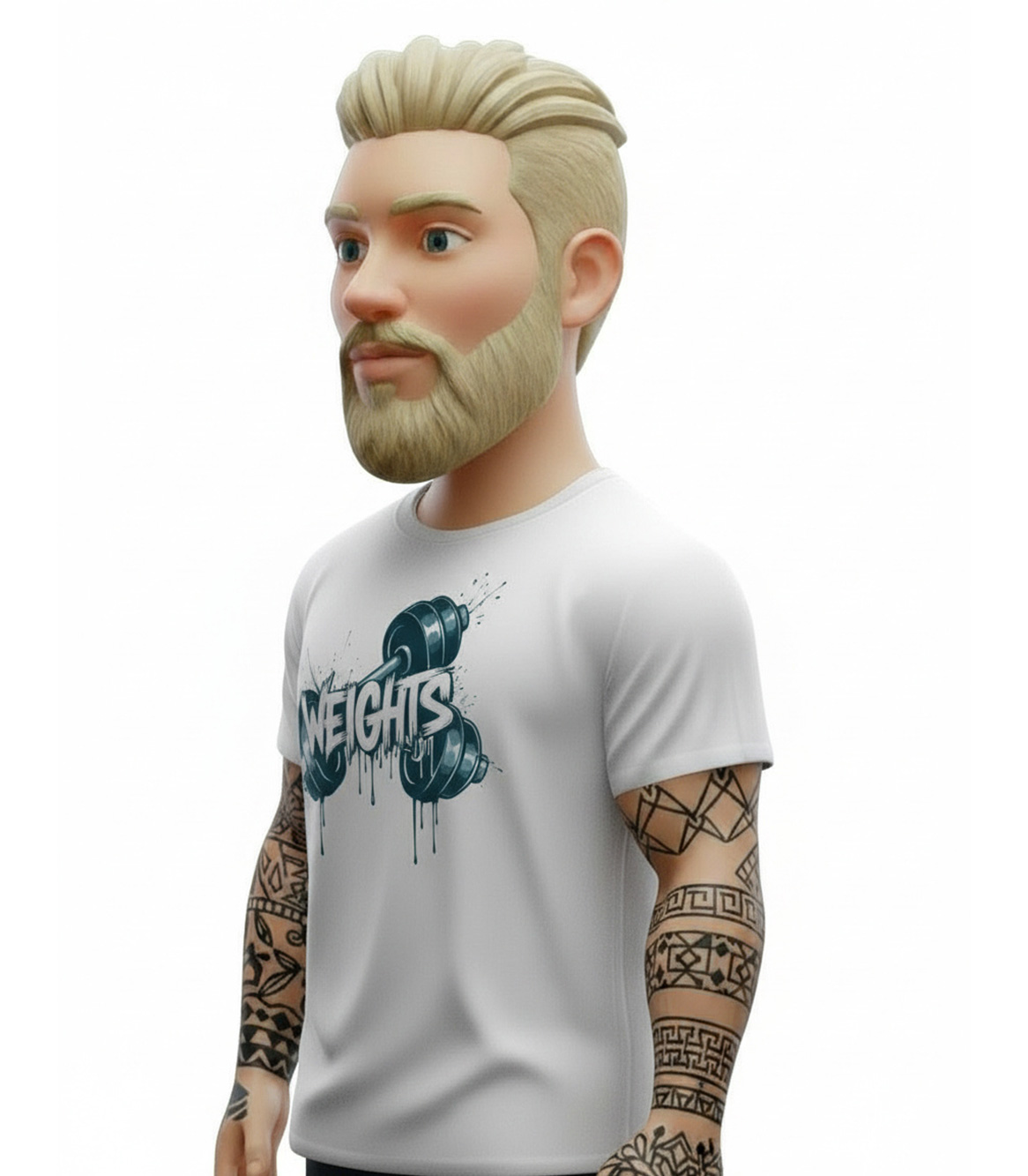 Λευκό T-shirt με print “Weights”, ιδανικό για street workout και casual στυλ.